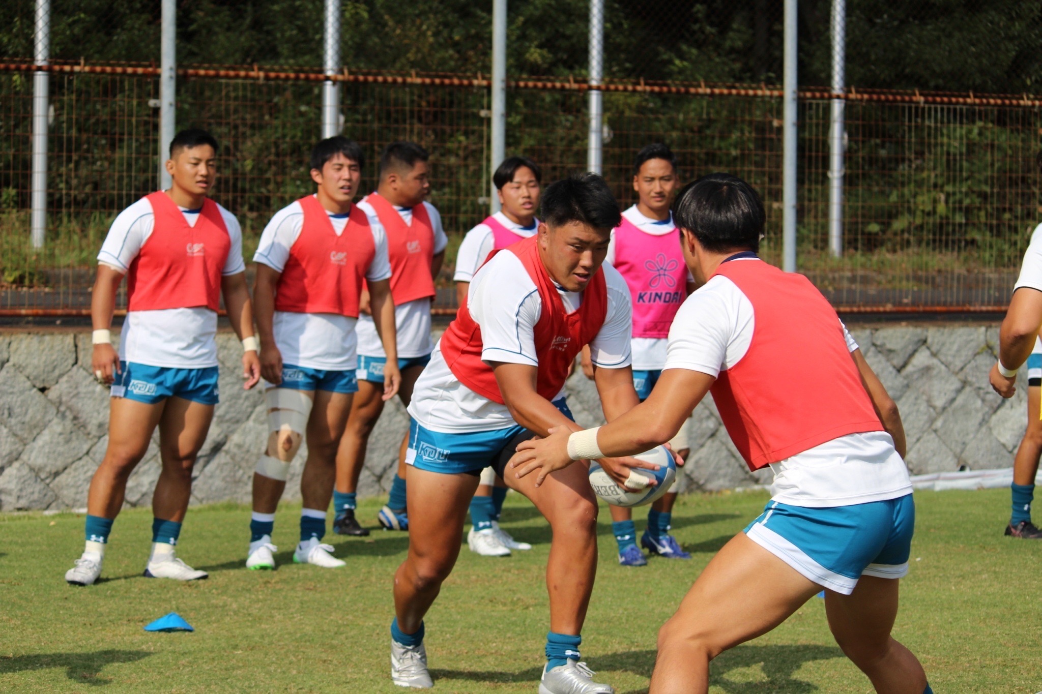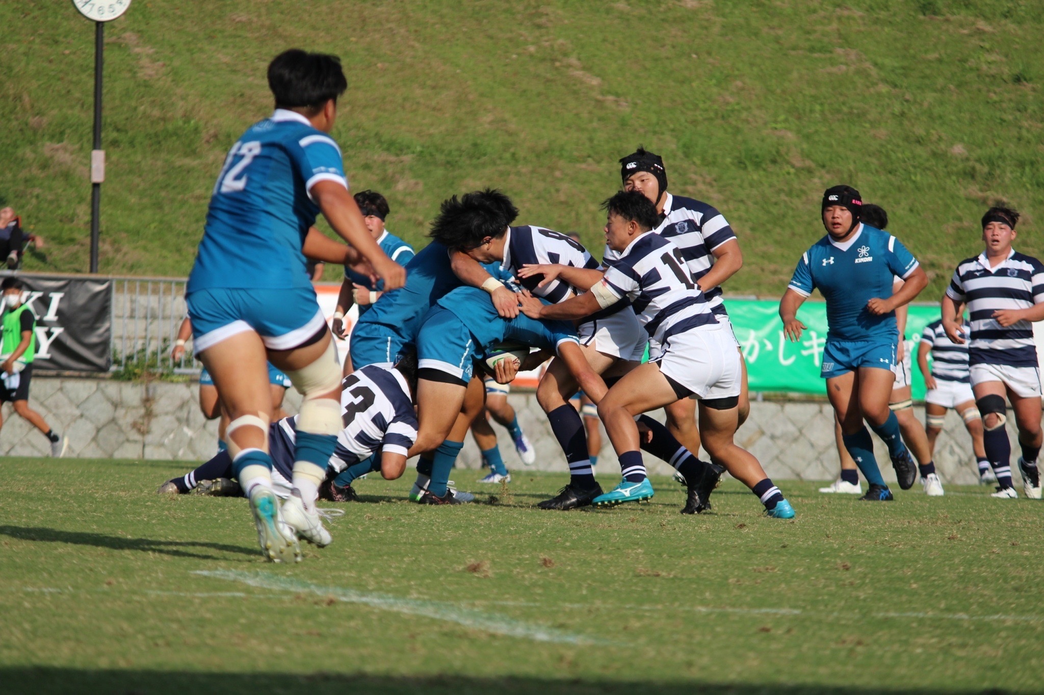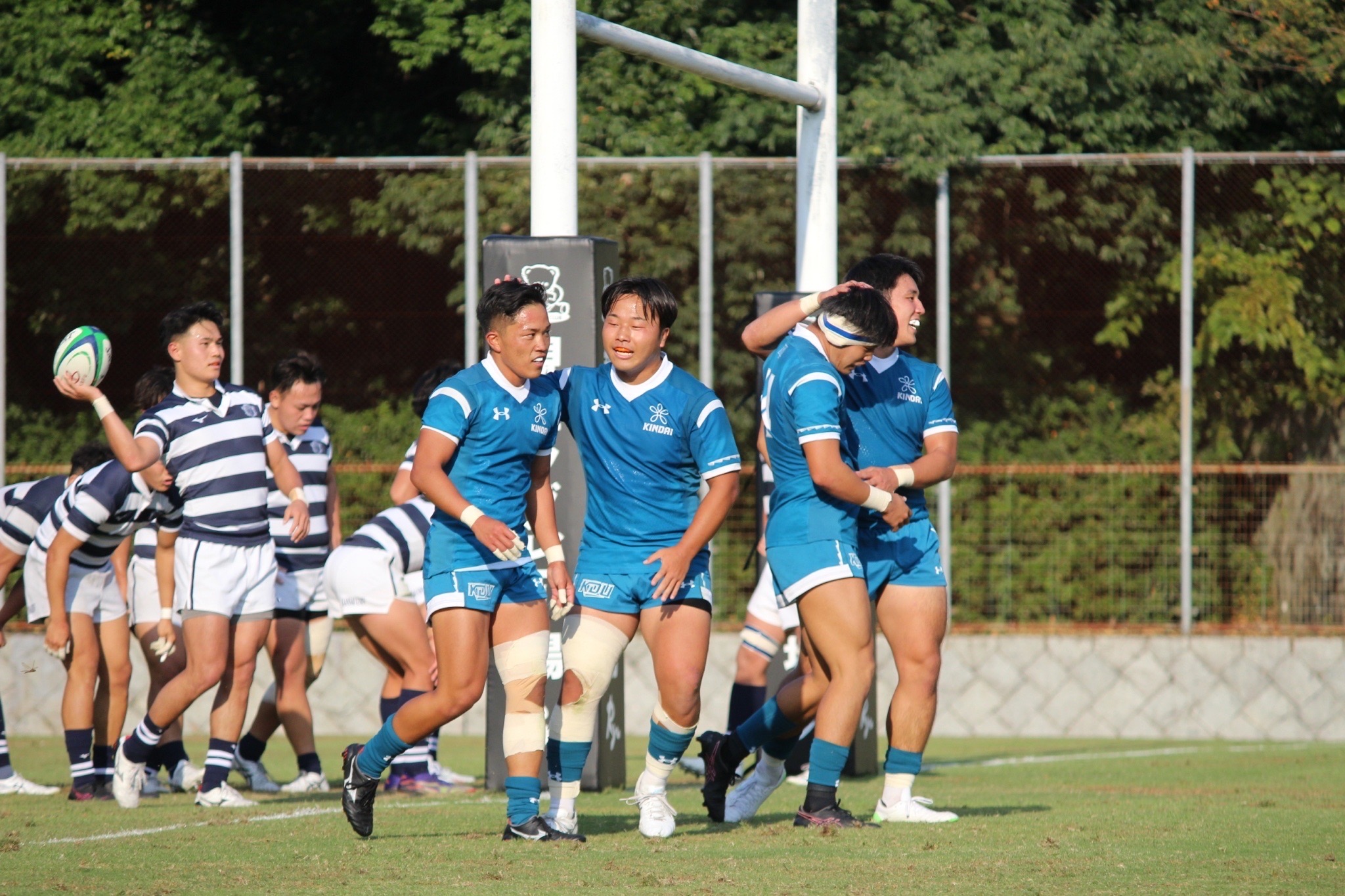 28分 近畿大 敵陣22m付近左中間ラックより9田原ー8古寺ー4駒井とつなぎ左中間トライ(48-7)