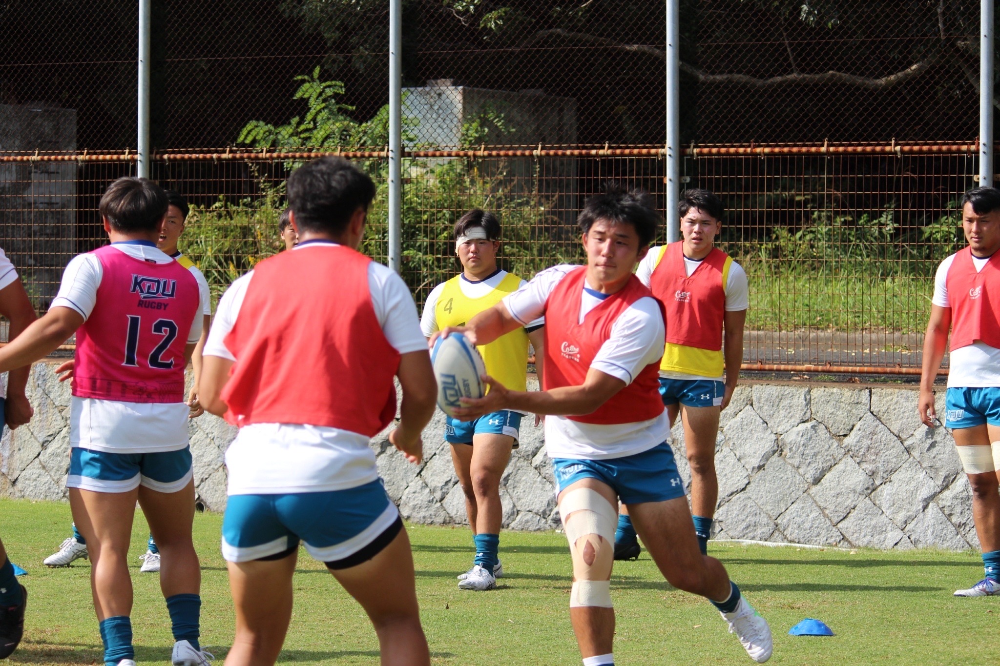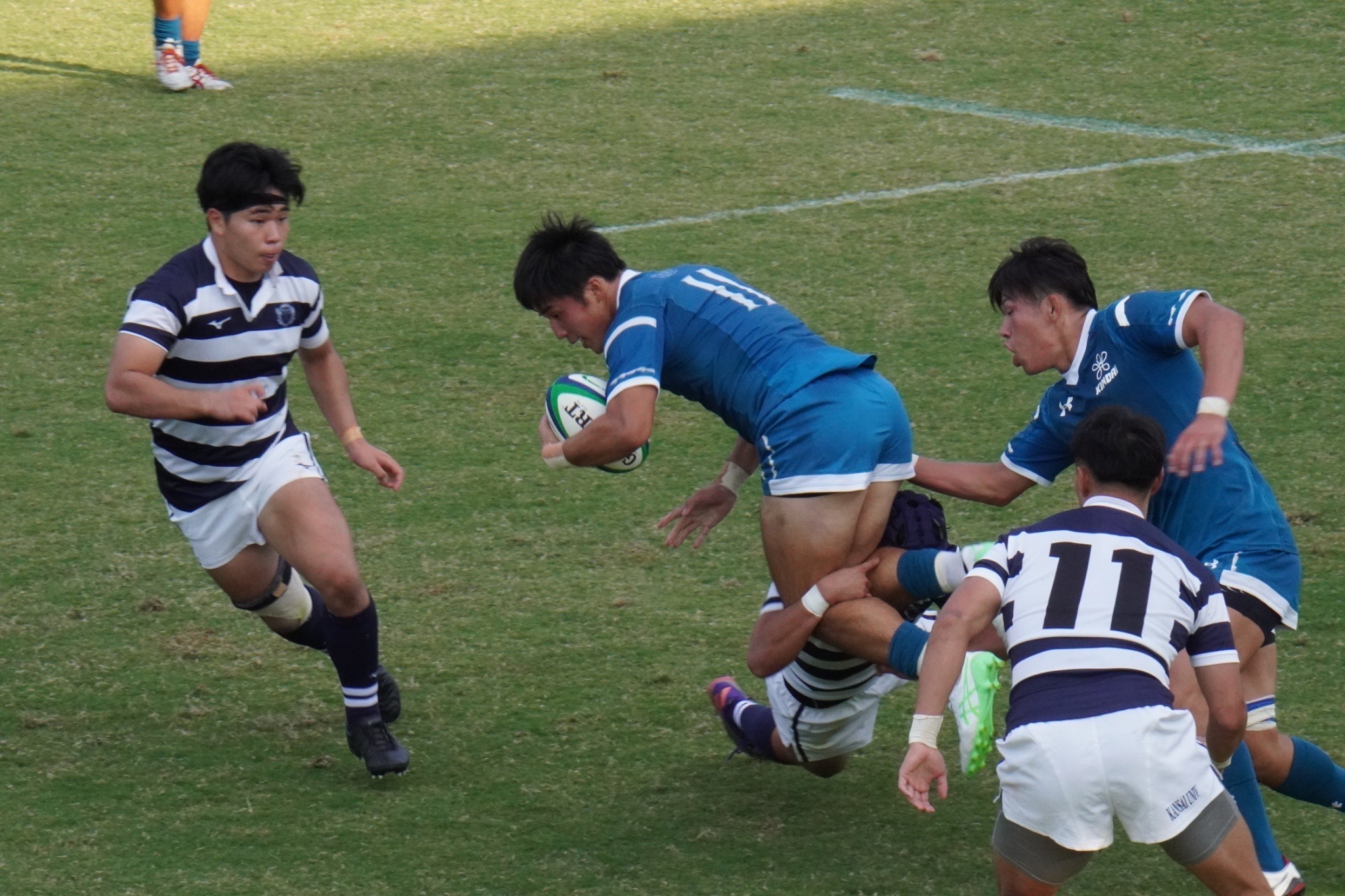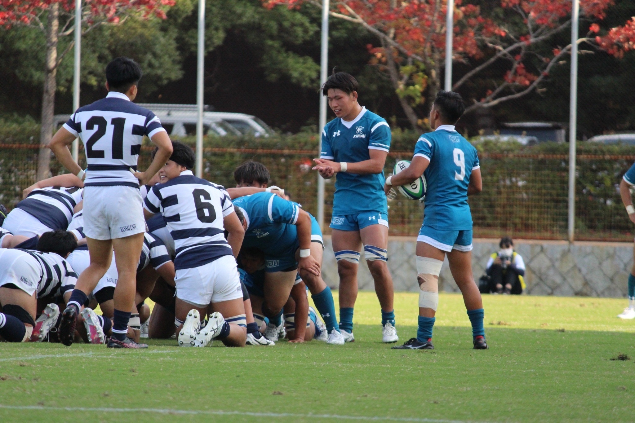 28分 近畿大 敵陣22m付近左中間ラックより9田原ー8古寺ー4駒井とつなぎ左中間トライ(48-7)