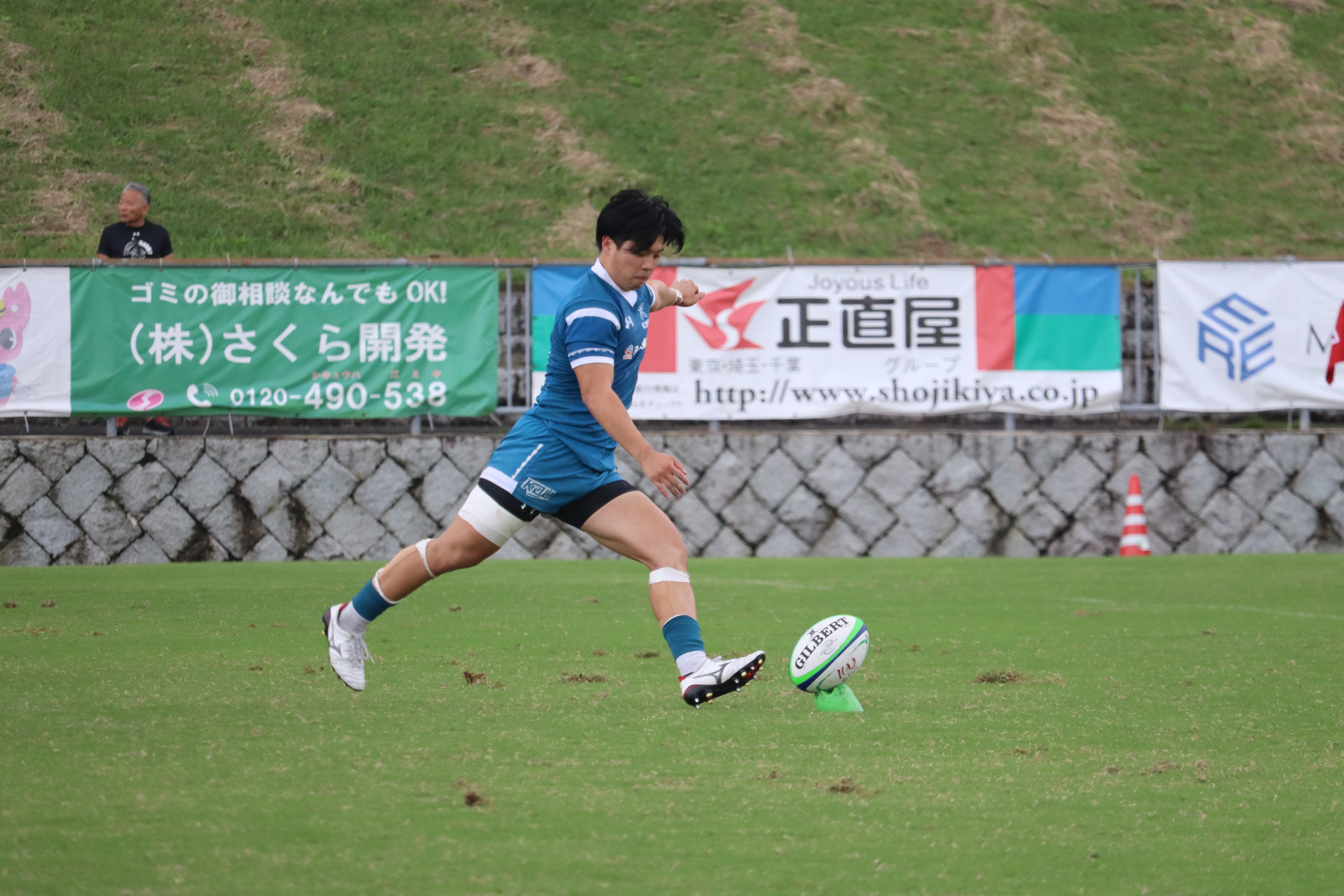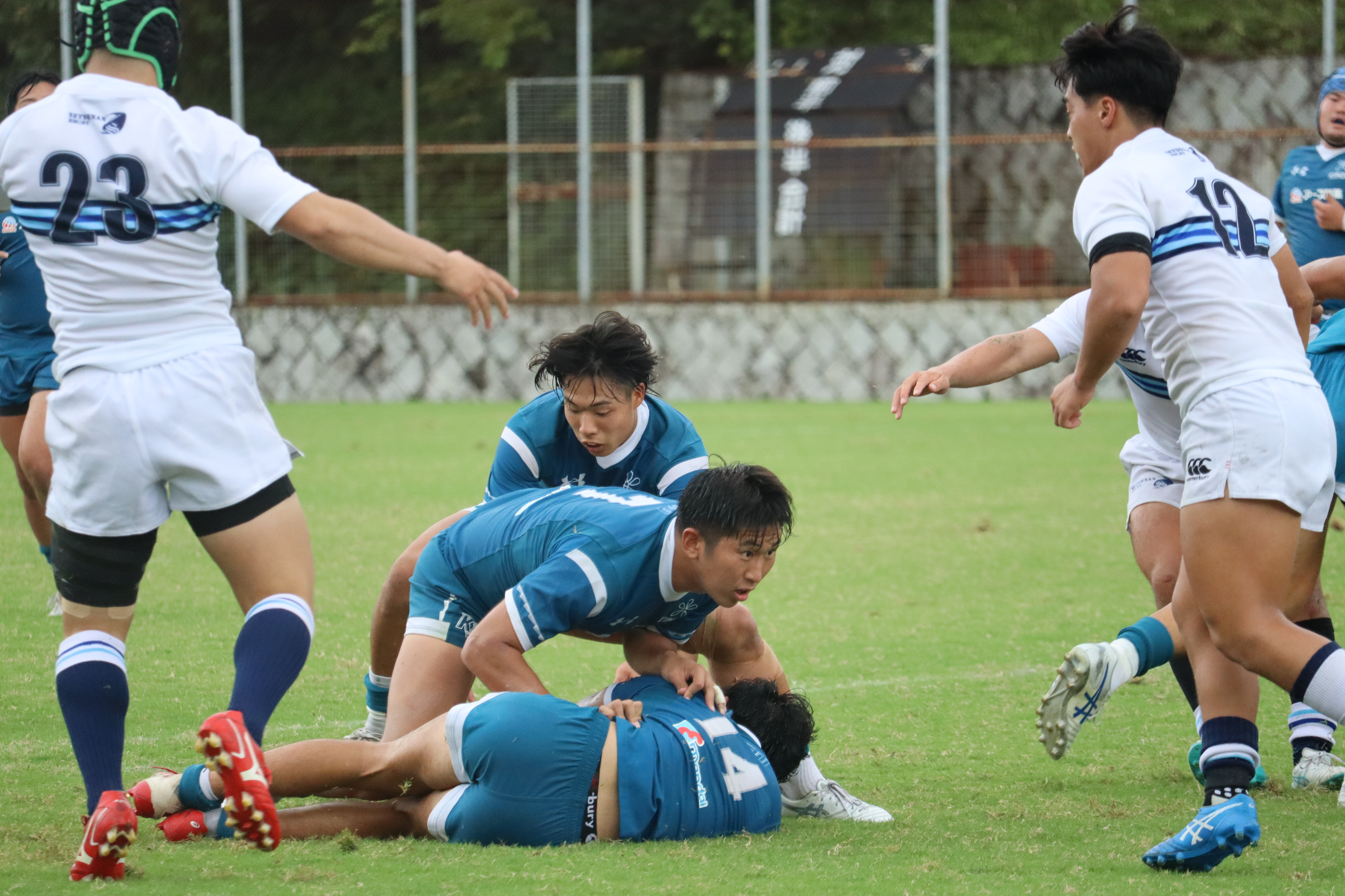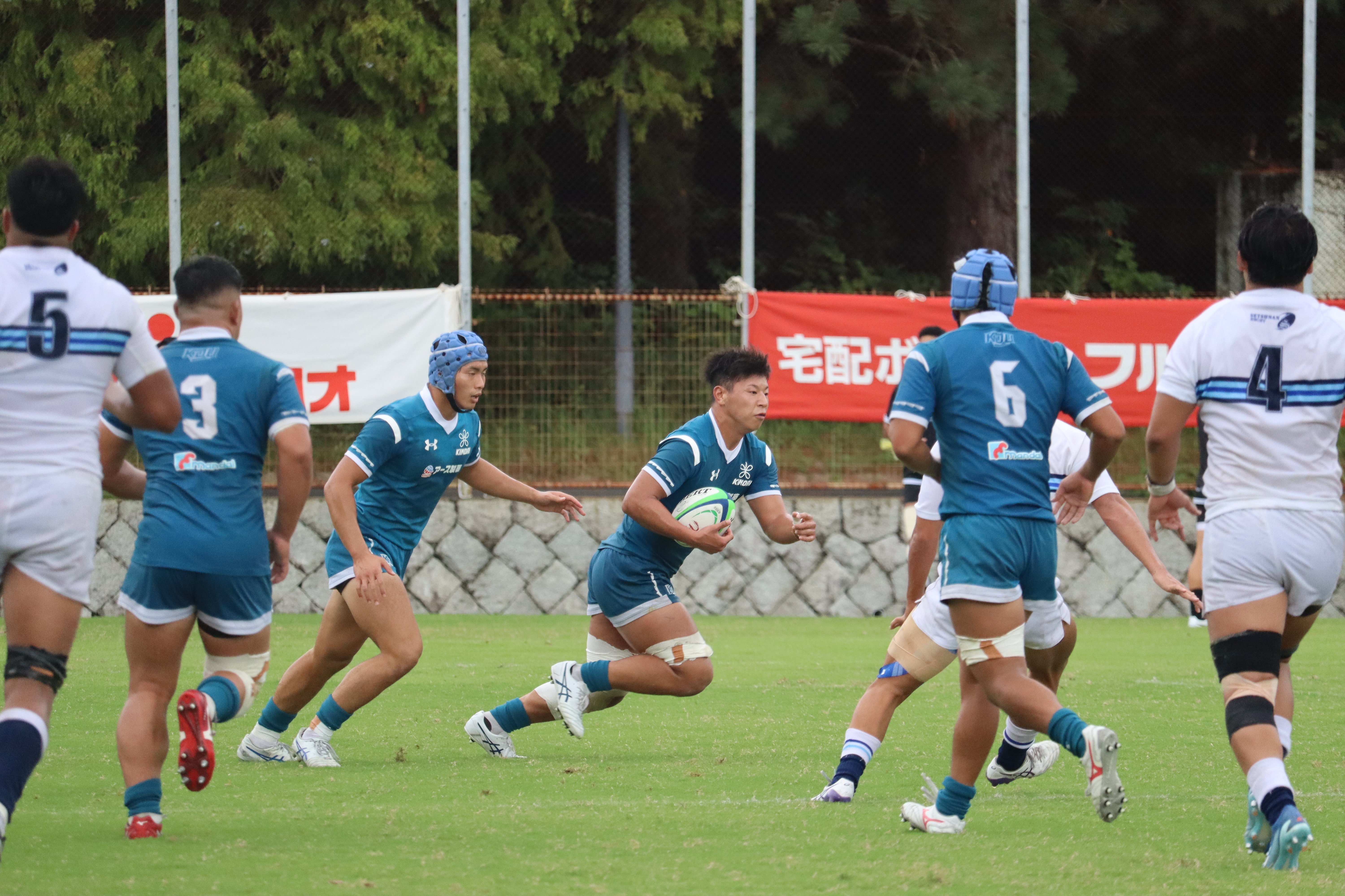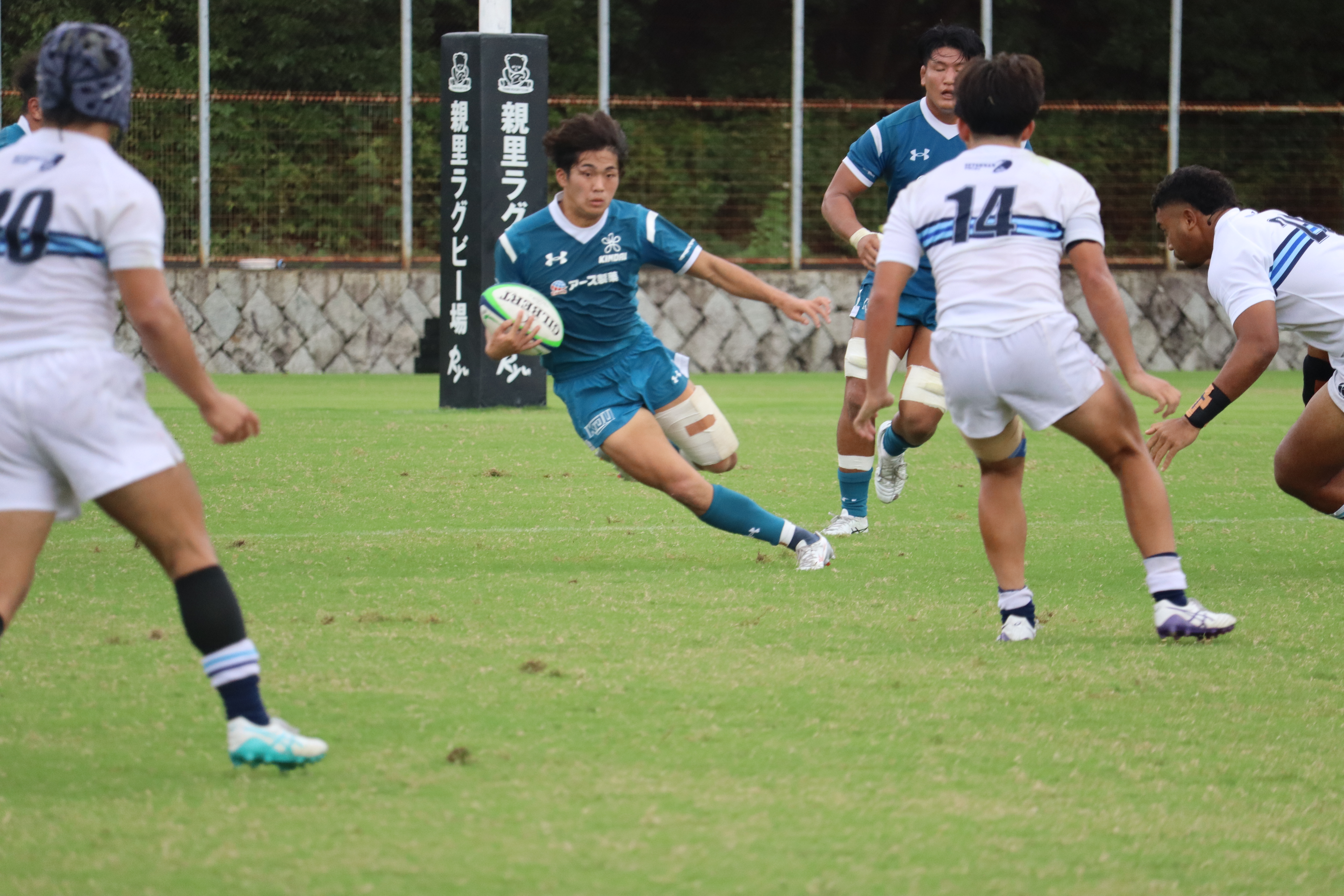 敵陣10m付近中央ラックより、9渡邊-7加藤-10須田-14太田とつなぎ左中間トライ(33-14)