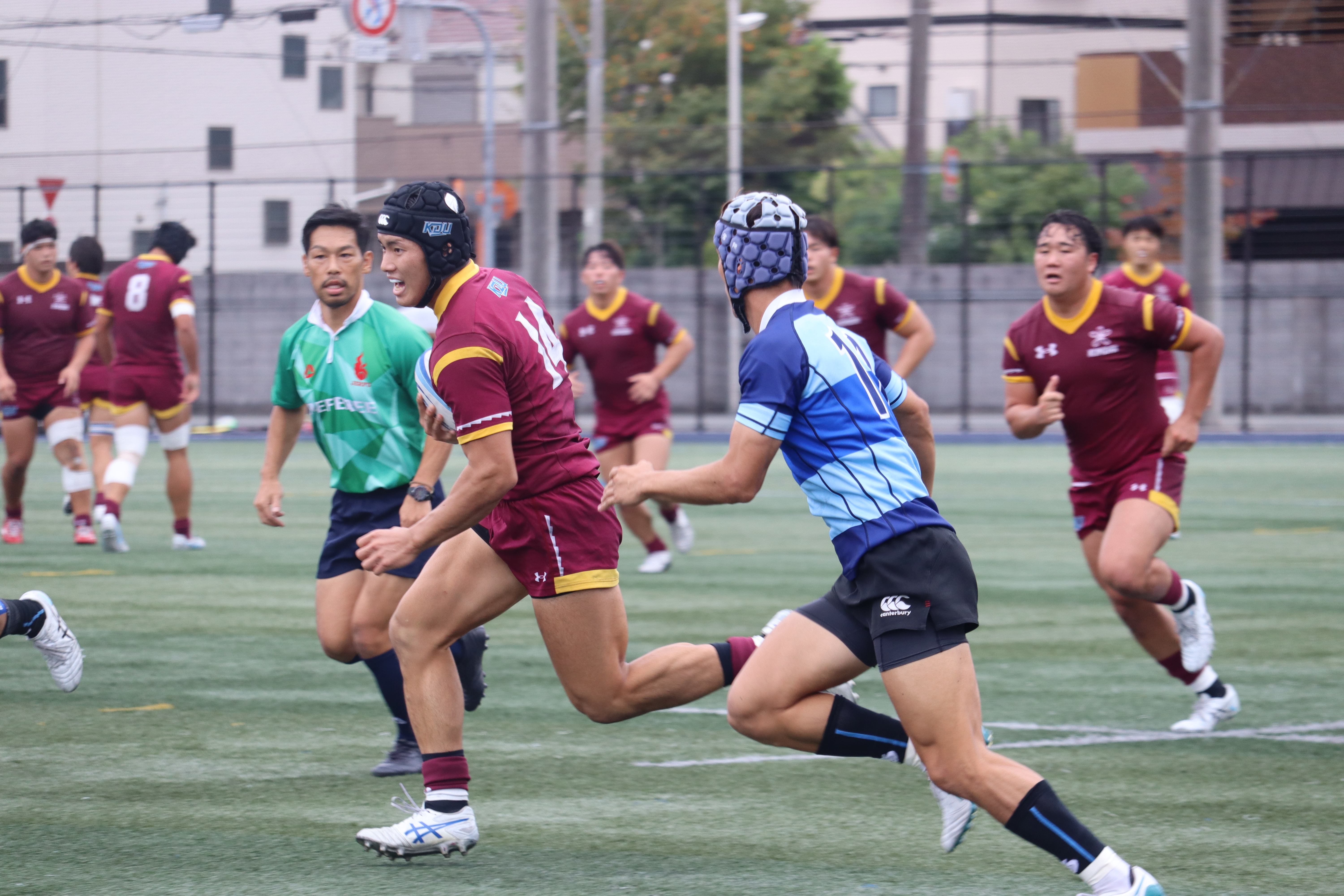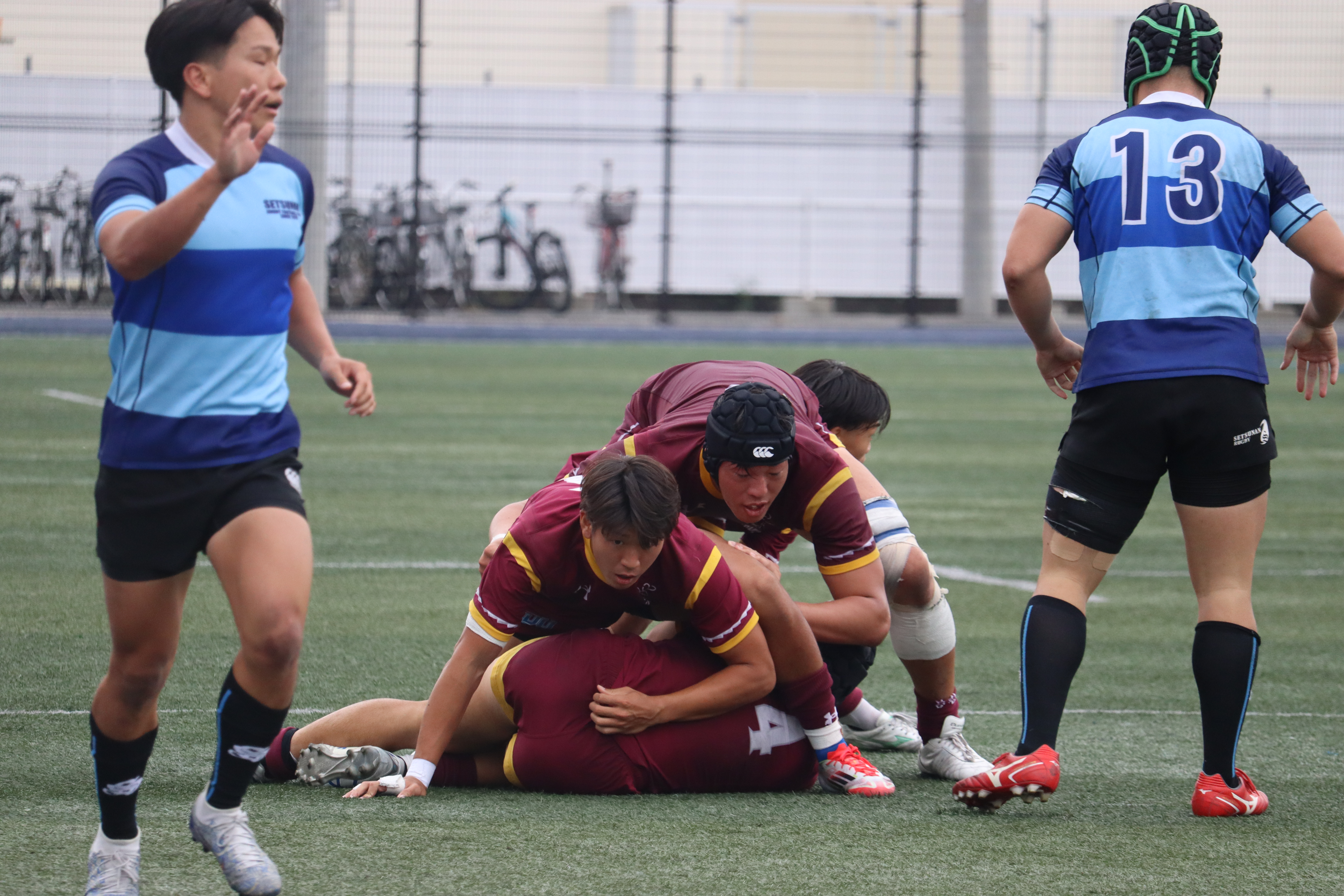 敵陣10m付近摂南大のミスボールを拾い、21面家₋10土屋₋24内田₋22小島とつなぎ中央トライ(39-14)