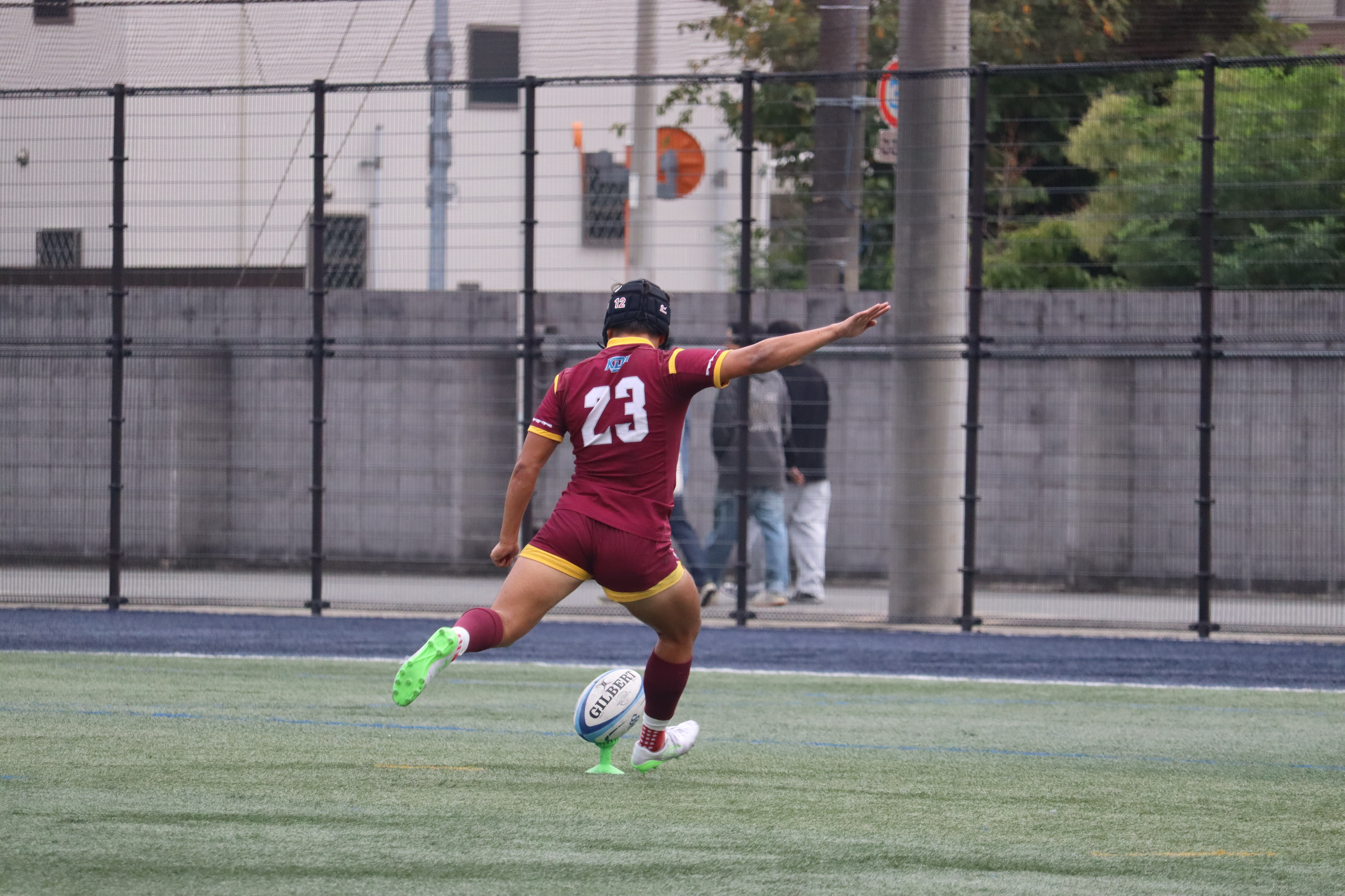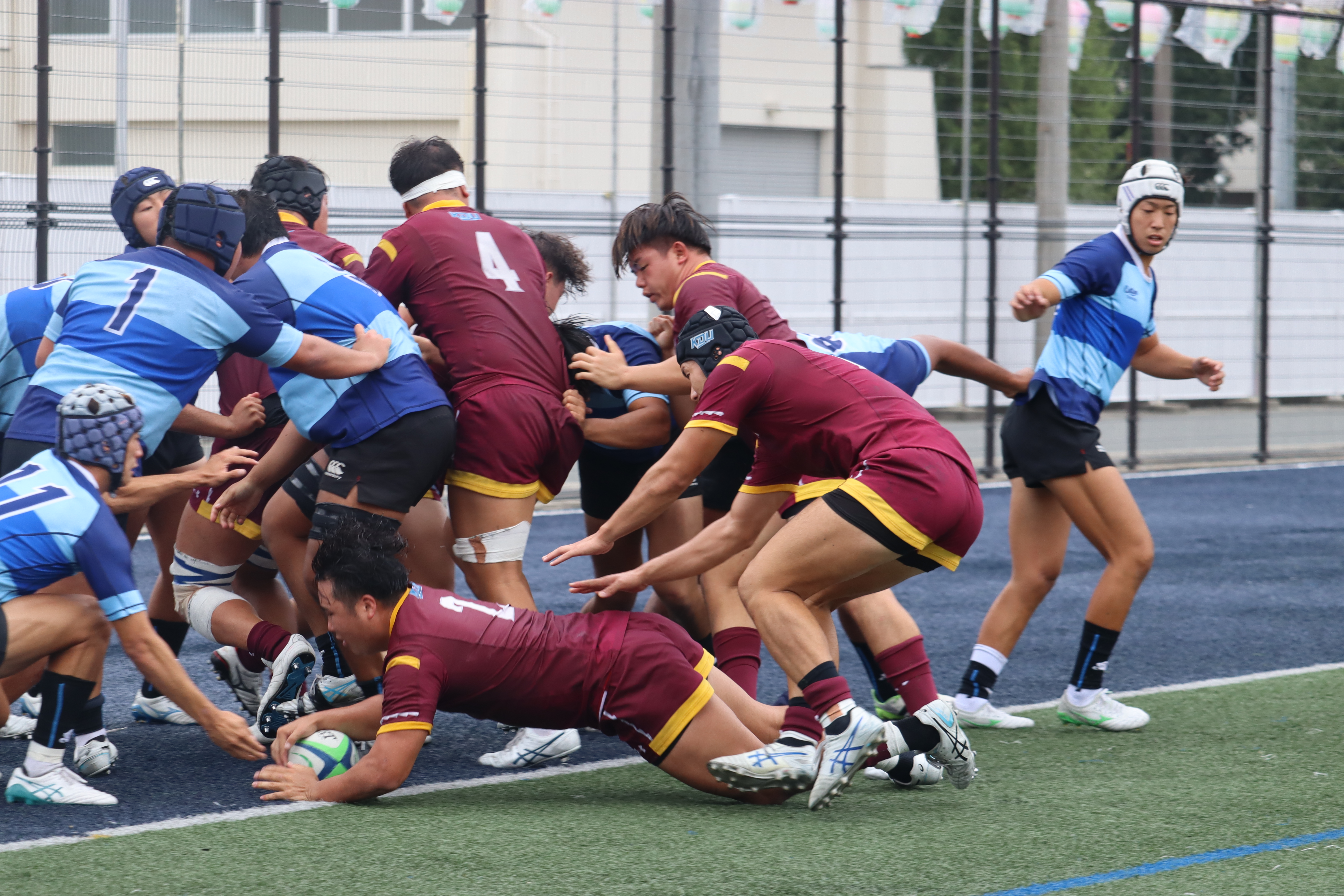 自陣10m付近左中間ラックより9篠原₋2井上(貴)₋10土屋₋12吉田(幹)₋13坂口₋11芝田₋7水流₋11芝田とつなぎ左中間トライ(24-7)