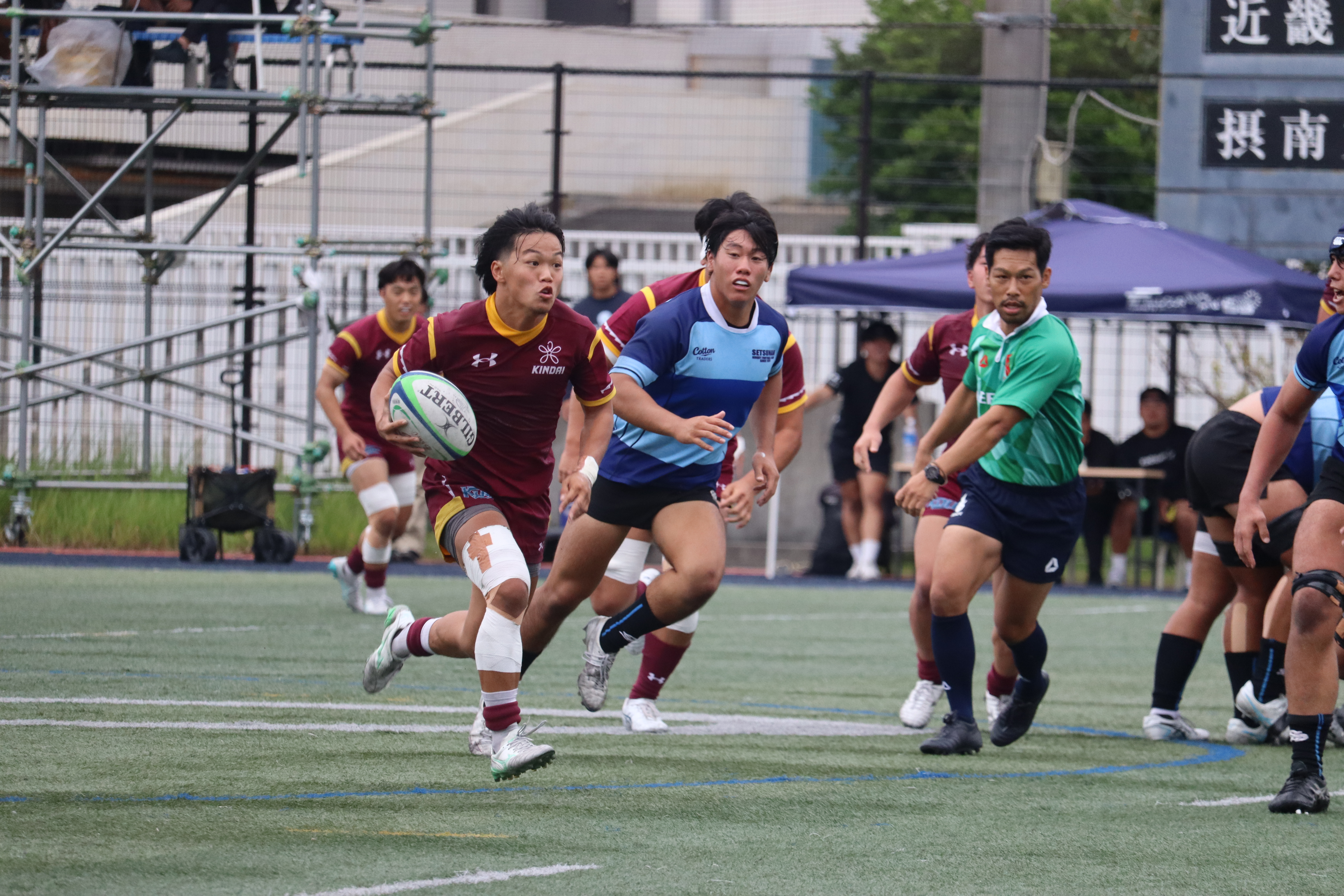 ハーフウェイライン付近近畿大のミスボールを背番号9₋10₋14とつなぎ中央トライ(19-5)