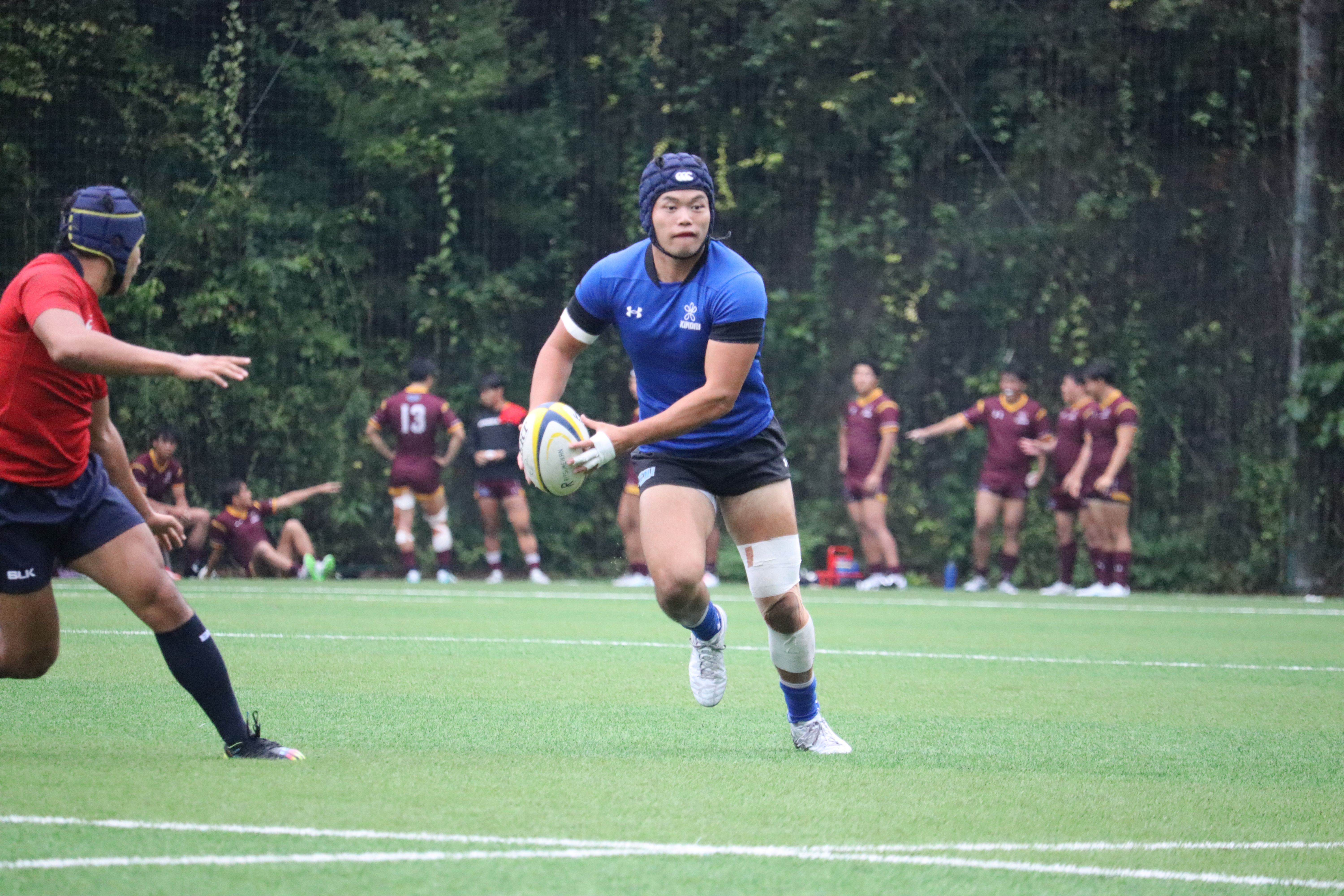 自陣5m付近近畿大のミスボールを、背番号15がキックしそのまま右中間トライ(0-10)