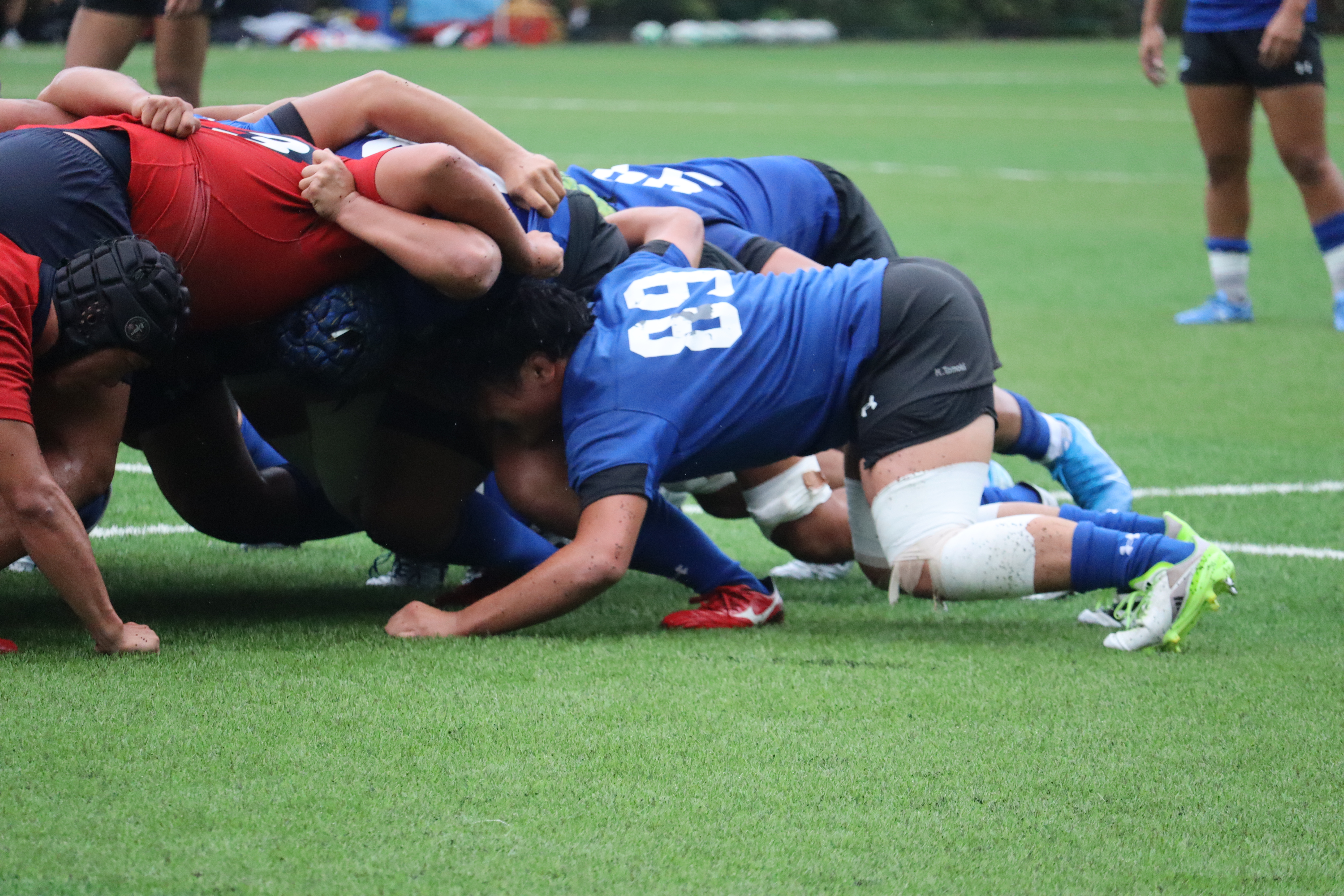 敵陣ゴールライン前左中間ラックより、背番号7が持ち出しそのまま左中間トライ(0-5)